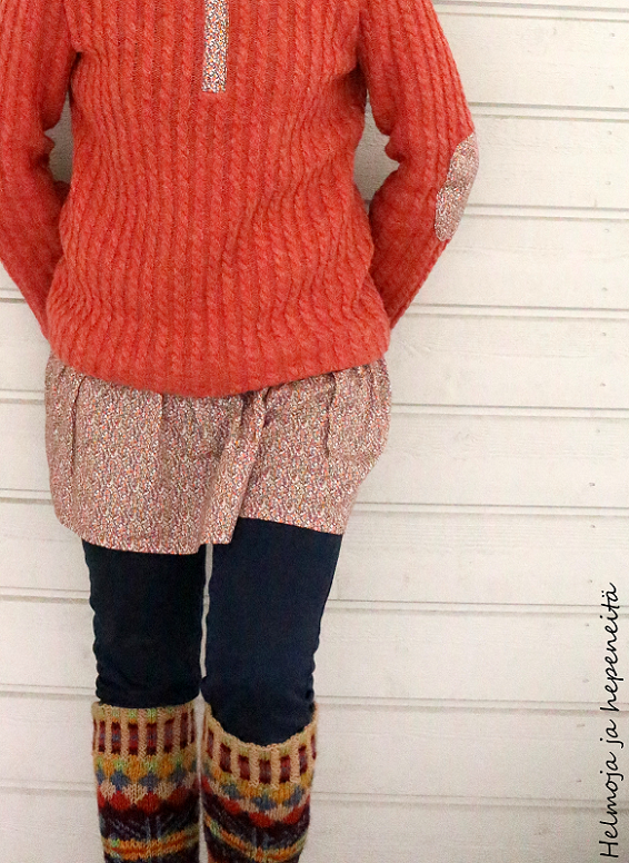 Sukkien pariksi sain inspiraation ommella itselleni keskivahvan villaneuleen Eurokankaan villa-polyamidisekoituksesta. Yhdistin siihen ihanaa Libertyn puuvillakangasta, jota tilasin aiemmin Karuselli-kaupasta. Käytin sitä helmaan, nepparilistaan, kyynärpaikkoihin ja pääntien ja hihansuiden huolitteluun. Nättiä kangasta jäi vielä jemmaan helletopin verran tai tyttöjen juttuun. Olen kaivannut tällaistä keskivahvaa neuletta vaatekaappiini ja tästä tuli aika kiva. Neulos tuntuu olevan vain melko venyävää ja saattaa olla, että hihoja täytyy kaventaa vielä uudemman kerran. Toisaalta halusinkin tästä sellaisen löysän ja rennon, jonne mahtuu pitkähihainenkin alle, mutta rajansa nyt kaikella kuitenkin! Kaavapohjana oli Burdan pusero, mutta eipä siitä taida hirveästi olla jäljellä mitään.