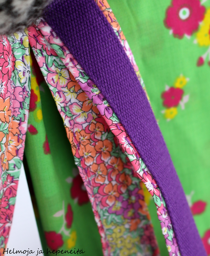 Väkkäröihin sain hyvin menemään pienempiä tilkkuja, yritin valita sävyjä, jotka ainakin viime kesänä olivat tytön suosikkeja. Ehkä olisi voinut pitäytyä vain muutamassa sävyssä, mutta näillä nyt mentiin. Takapuolen geisha-kankaan on mies joskus tuonut minulle ja koska olemme kumpikin tytön kummeja, oli minusta tosi kiva ajatus laittaa miehen valitsema kangas peiton takapuolelle. Sellainen perinteinen aloittelijan kommervinkki tietysti kävi, että tuo valkoinen taustakangas, jossa on siis valkoista tekstiä loppui kesken ennen muutamaa blokkia ja laitoin loppuihin sitten ihan tavallista valkoista lakanakangasta. Vasta terassilla luonnonvalossa näitä kuvia ottaessa huomasin, että valkoista on montaa sävyä ;). Ovat siis hieman eri sävyä, mutta ajattelin, että "hullu ei huomaa ja viisas ei virka". Kävi kyllä mielessä, että voinko antaa peittoa sittenkään lahjaksi, mutta päätin hylätä ajatuksen - voin antaa.